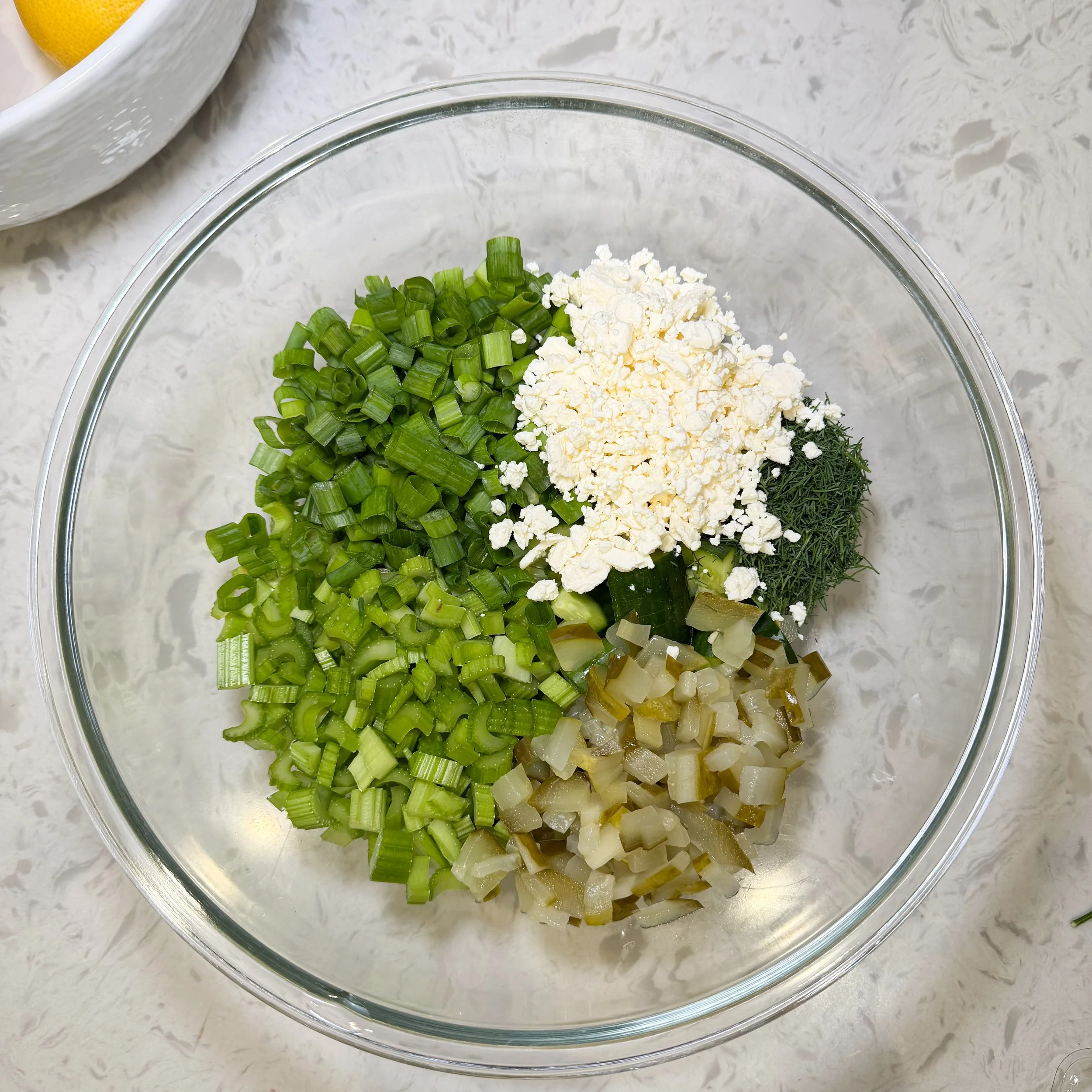 While chicken marinates, chop the celery, green onion, cucumbers, dill, and pickles.