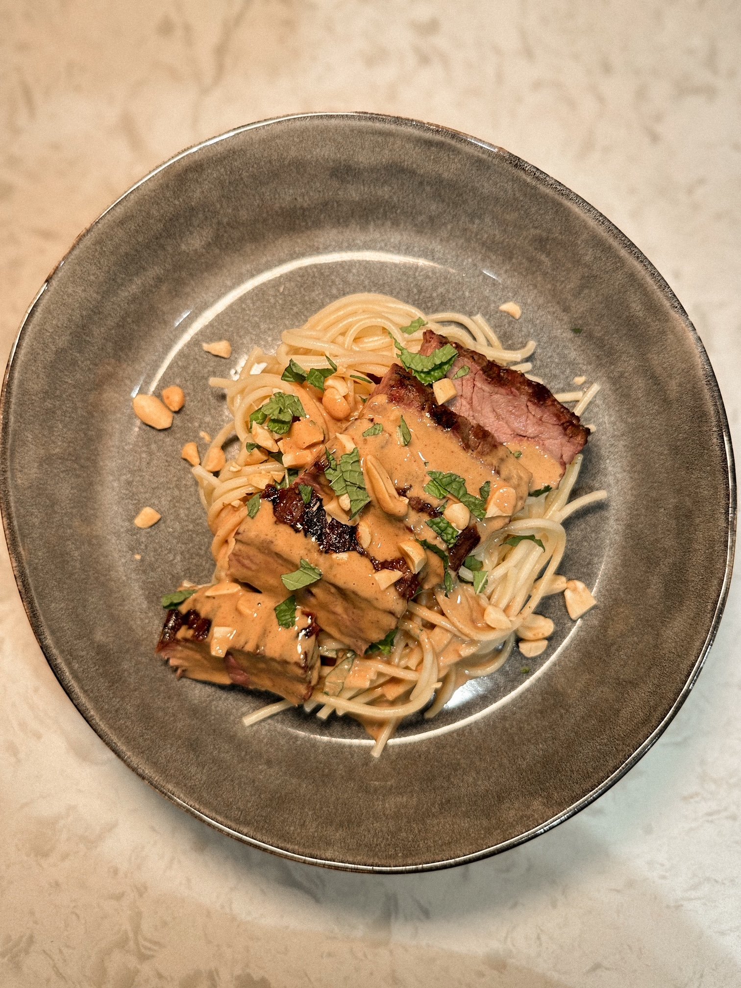 add noodles to bowl and top with steak, mint, cilantro, green onion and drizzle with that peanut sauce. Enjoy!